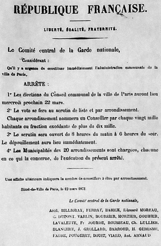 Eine der ersten Entscheidungen des Zentralrates der Nationalgarde ist die Ausschreibung von Kommunalwahlen am 22. März (sie finden dann am 26. März statt). Die in der Stadt gebliebenen Bourgeoises versuchen sie durch Straßenkrawalle zu hintertreiben und werden geschlagen.