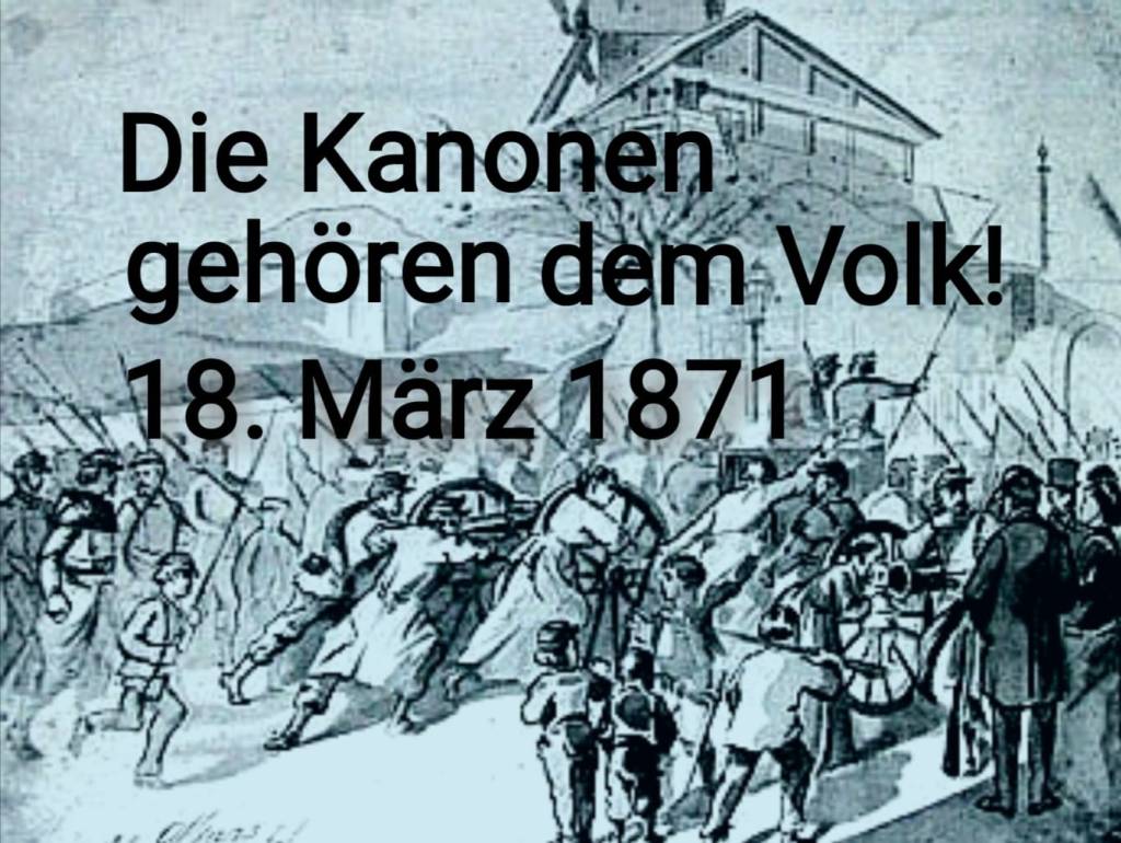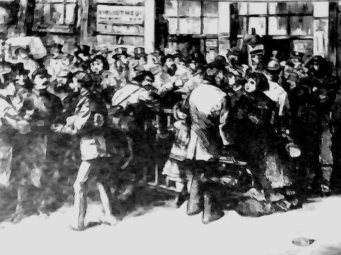 Nach den Ereignissen vom 22. März verlassen Angehörige der besitzenden Klasse fluchtartig die Stadt. Am Nordbahnhof, dem einzigen, von dem noch Eisenbahnzüge abgehen, drängen sich Angehörige der Bourgeoisie vor den Fahrkartenschaltern, um einen Platz nach Versailles zu ergattern.