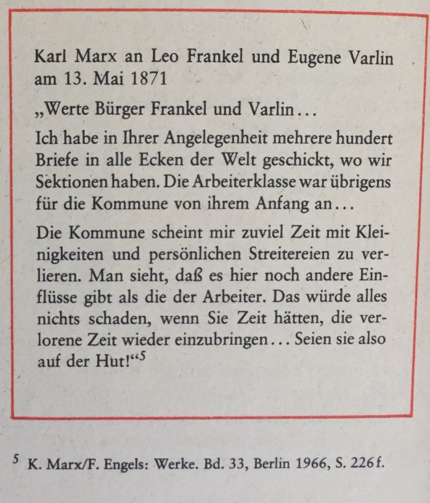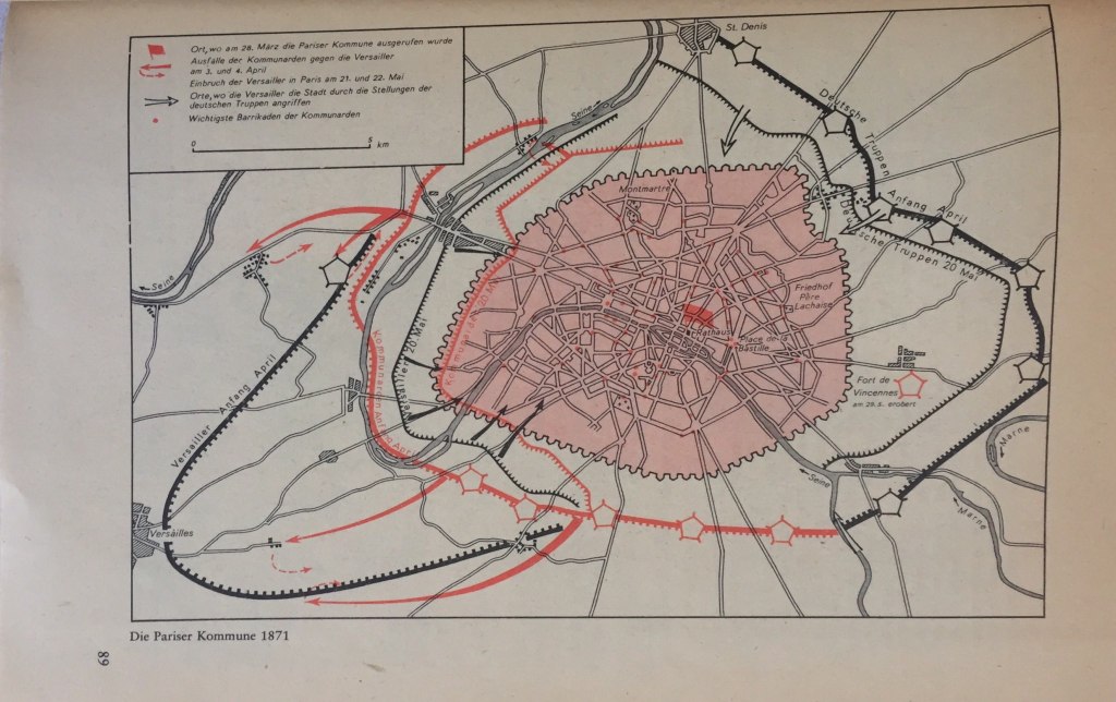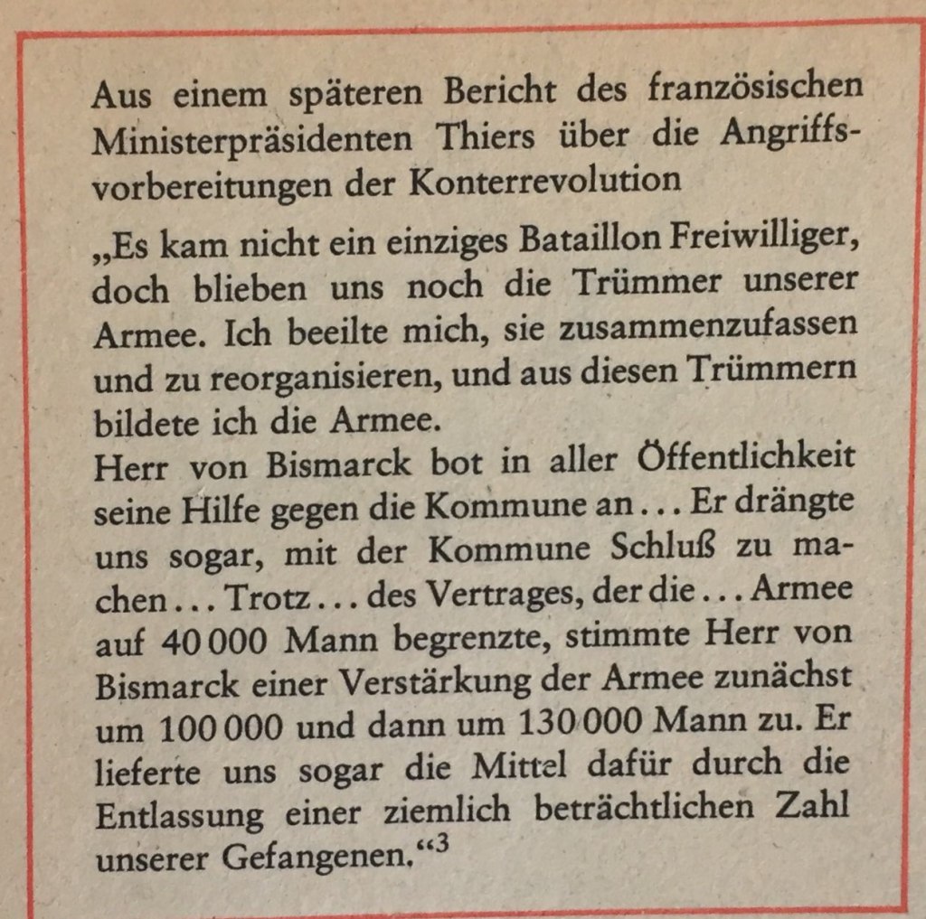 Die Kommune hatte keinen Angriff auf Versailles, das „Schlangennest der Konterrevolution“ unternommen. Die Regierung Thiers dagegen bereitete den Bürgerkrieg gegen die Kommune mit Unterstützung Bismarks vor.