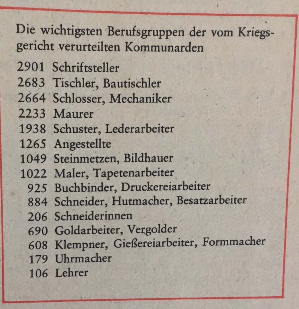 Etwa 30 000 Menschen wurden ermordet. Über 40 000 Kommunarden wurden eingekerkert oder zu Zwangsarbeit verurteilt, die meisten von ihnen gingen an Entbehrungen zugrunde. Die Pariser Schuhindustrie beschäftigte vor dem 18. März 1871 etwa 24 000 Arbeiter. 12 000 von ihnen waren während der Konterrevolution ermordet worden oder mussten das Land verlassen.
