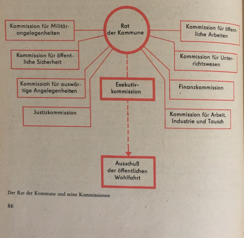Der Rat der Kommune vereinigte in sich die gesetzgebende und die ausführende Gewalt. Er beschloss Gesetze, und die Ratsmitglieder setzten selbst die Gesetze in die Tat um.